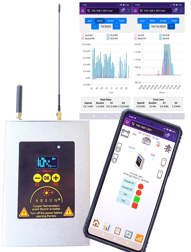 Dés qu'un surplus de production par rapport à la consommation est détecté, l'énergie est automatiquement dirigée vers les 4 sorties selon la priorité choisie