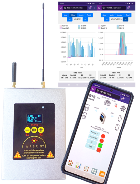 ARSUN-T1 - Triphasé compatible batteries (fonctionne avec ou sans batteries 12V, 24V, 48V Non compatible batteries PLug And Play et Haute tension)Fabriqué et vendu par la société AnaSun Tel 06 84 65 33 78ARSUN a mis fin à sa collaboration avec la société Hilosun. Hilosun doit, conformément à la loi, assurer la garantie des appareils qu'il a fabriqués et vendus. Ses coordonnées se trouvent sur la facture du produit.Fonctionne sur les systèmes triphasés avec chauffe-eau monophasé.Notice et plans dispos (onglet triphasé).Accepte les batteries 12V, 24V et 48V. N'accepte pas les batteries haute tension.Compatible avec les installations comportant des batteries 12v, 24V, 48V en achetant séparément une sonde disponible chez SunEquip.Ne peut en aucun cas charger des batteries